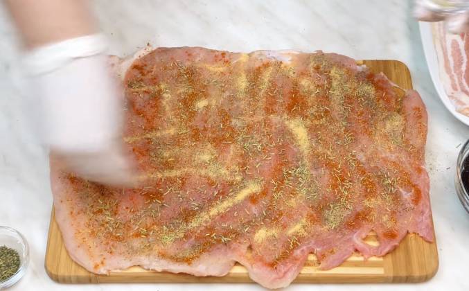 2. Главное, не спешите, делайте это аккуратно! Вот так из тонкого кусочка мяса можно получить отличный мясной пласт для приготовления любых рулетов! Накрываем мясо пленкой и отбиваем для того, чтобы не просто размягчить мясо, но и придать куску равную толщину. Если у вас не получается разрезать мясо в единый пласт, соберите его из нескольких отбитых кусочков свинины, а затем уложите их внахлест друг на друга. Отбитое мясо необходимо посолить, поперчить, присыпать паприкой и натереть чесноком - я использую сухой чеснок. В качестве ароматических специй и пряностей я взяла розмарин и тимьян, но вы берите по вашему вкусу, а то и вовсе можно обойтись солью, перцем и чесноком.