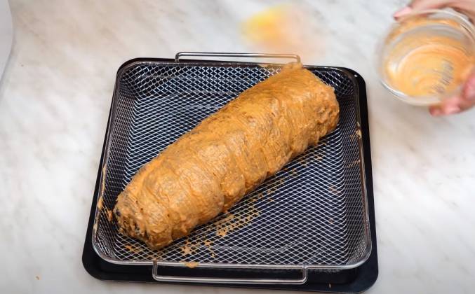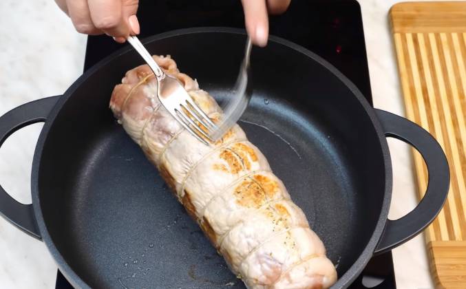 4. Теперь устанавливаем сковороду на плиту, вливаем буквально одну ложку масла и хорошо разогреваем. Выкладываем рулет в горячую сковороду и обжариваем со всех сторон, включая срезы до румяной корочки. Обжаренный рулет выкладываем на двойной пергамент или фольгу и плотно заворачиваем. Перекладываем на решетку, противень или в форму для запекания и отправляем в аэрофритюрницу или духовку, разогретую до 180С на 40-60 минут в зависимости от размеров рулета. Через час достаем рулет, разворачиваем и срезаем нитки.