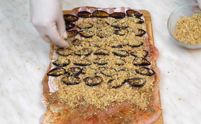 3. С того края, откуда будем сворачивать рулет, укладываем внахлест ломтики бекона, если у вас кусок свинины более жирный, то бекон можно не использовать. С чернослива сливаем коньяк и раскладываем его поверх бекона. Чернослив можно использовать целиком как у меня или измельчить на мясорубке или блендере, а затем ровным слоем выложить фруктовую начинку на мясо. Вместо чернослива можно взять курагу, вяленую вишню или клюкву. Сверху равномерно посыпаем грецкими орехами, предварительно обжаренными на сухой сковороде и измельченными в блендере в крупную крошку. И теперь не спеша, очень аккуратно сворачиваем мясо с начинкой в плотный рулет. Перевязываем рулет кулинарной ниткой или шпагатом так, чтобы при обжаривании он не развалился, лишние нитки срезаем. Вот такая плотная заготовка должна получиться.