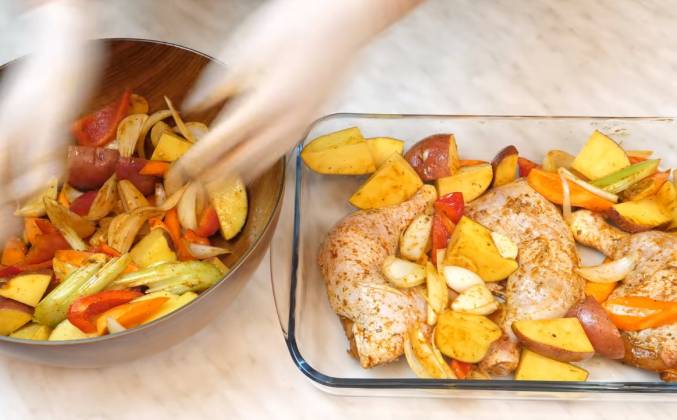 5. Помимо тех, что я взяла, для этого рецепта очень хорошо подходят грибы, капуста брокколи, лук порей, спаржевая фасоль, помидоры черри, зеленый горошек, баклажаны и цукини. За полтора часа до подачи на стол достаем курицу из холодильника и выкладываем ее на противень или в форму для запекания. Маринад, в котором была курица не выбрасываем, а добавляем к овощам и еще раз все смешиваем. Выкладываем ароматные овощи в форму так, чтобы курочка оказалась сверху.