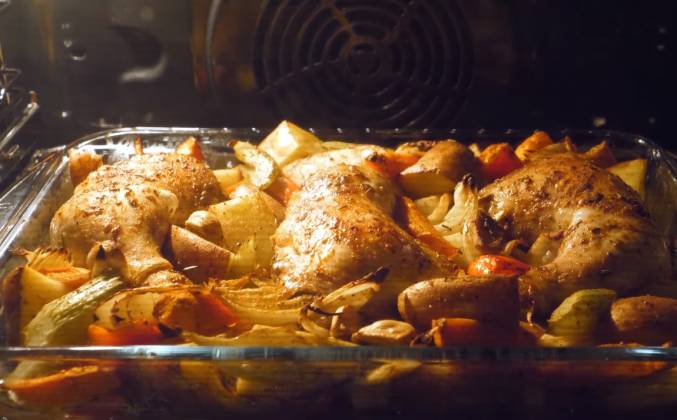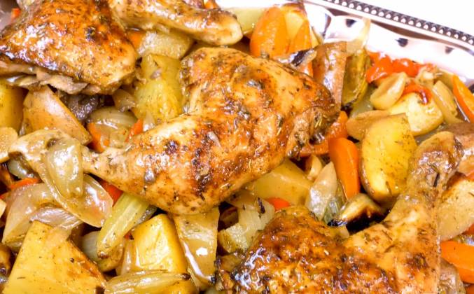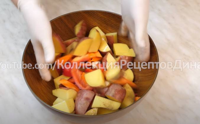 6. Отправляем подготовленную форму в заранее разогретую духовку и запекаем при температуре 190-200С на режиме верх+низ до готовности. В зависимости от возможностей вашей духовки, количества продуктов, их размера и нарезки, время запекания может варьироваться от одного до полутора часов, у меня на приготовление ушло 1 час 20 минут. Готовое блюдо достаем из духовки, поливаем выделившимся соком и подаем на стол.Видео рецепт ютуб ниже 👇