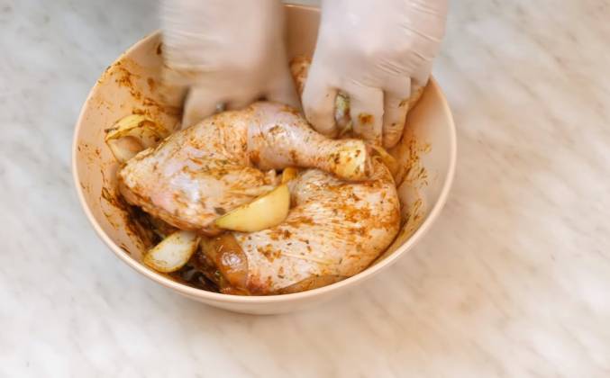 2. Туда же добавляем несколько кусочков свежего имбиря, 5-6 крупных зубков чеснока, разрезанных пополам и две головки репчатого лука, порезанного крупными кусками. Распределяем овощи равномерно среди курицы. Этот рецепт удобен еще тем, что птицу можно замариновать заранее и оставить ее в холодильнике от нескольких часов до нескольких суток и чем дольше она там маринуется, тем вкуснее получается! Накрываем миску пленкой или пакетом и убираем в холодильник хотя бы на час.