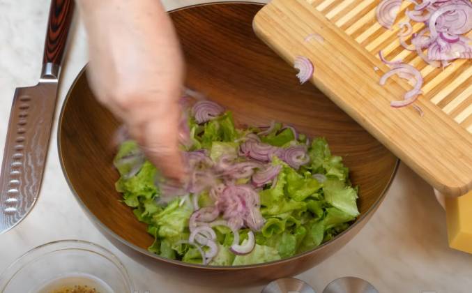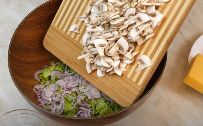 2. Одну среднюю или две маленьких фиолетовых луковицы нарезаем тонкой соломкой или полукольцами, слегка его разъединяем и отправляем к листовому салату. Молоденькие тепличные шампиньоны разрезаем пополам, а затем поперек на тонкие ломтики. Если вы никогда не готовили салаты и закуски с сырыми шампиньонами, то непременно попробуйте - это очень полезный для организма и при этом низкокалорийный продукт. Эти грибы содержат столько же фосфора, сколько и рыба, способны снижать давление, активизировать защитные силы организма и бороться со старением!
