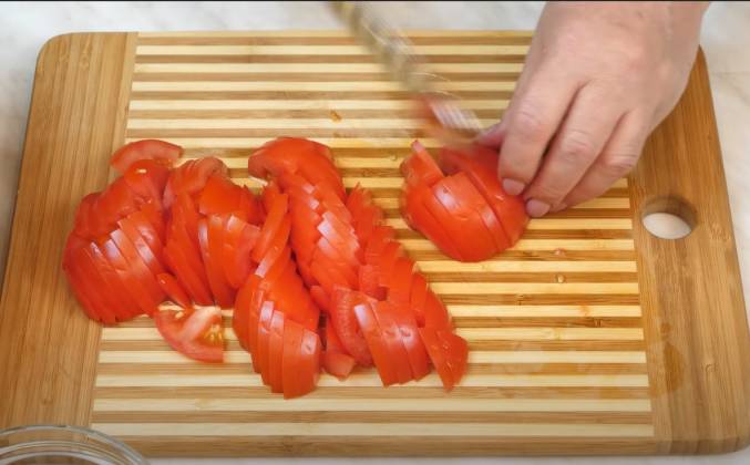 4. Отправляем помидоры к остальным продуктам. В таком виде, не перемешивая продукты, салат можно накрыть крышкой или пищевой пленкой и убрать на несколько часов в холодильник, а непосредственно перед подачей заправить готовой салатной заправкой и выставить на праздничный стол! Я сразу все приготовлю - выливаем в чашу заправку, слегка присыпаем перцем и солим по вкусу. Салат перемешиваем и сразу же подаем на стол!Видео рецепт ютуб ниже 👇
