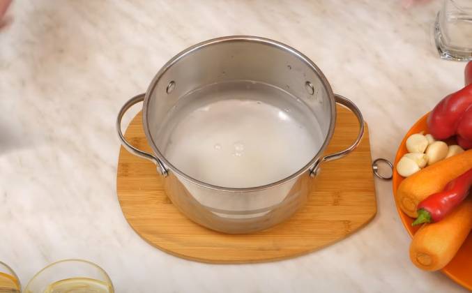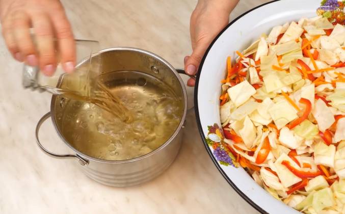 3. Тем временем закипел рассол - вливаем в кастрюлю 100 г растительного масла, 200 г 6% яблочного или винного уксуса и доводим маринад до кипения, но не кипятим. А пока маринад закипает, перекладываем овощи в эмалированную кастрюлю, объемом не менее 5 литров. Друзья, напомню, что я готовлю двойную порцию овощей, поэтому у меня на плите варится еще один литр маринада. Полный список ингредиентов я оставлю в конце видео и как всегда в описании. Заливаем овощи кипящим маринадом - один литр, а следом другой!