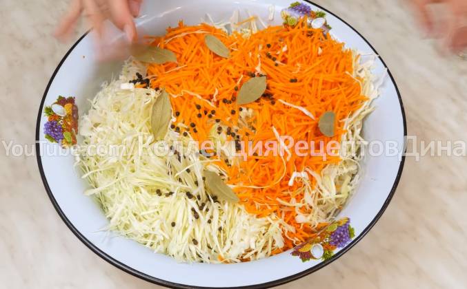 2. Капусту шинкуем тонкой соломкой, так, как вы обычно нарезаете для борща или, когда квасите капусту. В отличие от квашеной капусты, для которой подходят только поздние сорта, в этом рецепте можно использовать даже кочаны с зелеными листьями, в любом случае после приготовления готовая капуста получится идеально белая! Для удобства перемешивания перекладываем овощи в большой таз, добавляем 1 чайную ложку перца горошком и 5-6 лавровых листов. Все хорошо перемешиваем, при этом капусту мять не надо. Перекладываем ее в эмалированную кастрюлю, объемом не менее 5 литров, в которой будем мариновать.