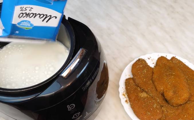3. Подготовленное таким образом филе оставляем на столе на полчаса для маринования. Тем временем подготовим молоко - его можно вскипятить в кастрюле на плите, я раньше так и делала, но сейчас я стала готовить филе в мультиварке, используя очень удобную функцию "Автоподогрев", которая автоматически включается по завершении любой программы. Выливаем в чашу 1 литр молока жирностью 2,5- 3,5%, включаем режим "мультиповар" на 100С и оставляем заданные 30 минут, за это время молоко хорошо прокипит, а за две минуты до окончания программы аккуратно опускаем подготовленное куриное филе в кипящее молоко так, чтобы оно полностью было им покрыто, закрываем крышку и как только время выйдет, автоматически включится функция подогрева.