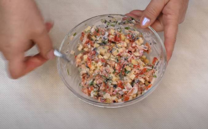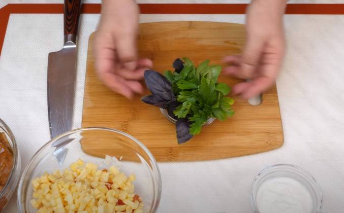 3. Половинку маленькой луковицы режем очень мелким кубиком, не любите сырой лук - обжарьте, четвертинку сладкого перца тоже нарезаем как можно мельче, один крупный или два небольших помидора разрезаем, удаляем плодоножку и режем маленьким кубиком, небольшой кусочек вкусного сыра, как и остальные продукты нарезаем как можно мельче. Из зелени я взяла фиолетовый и зеленый базилик и петрушку, но вы используйте любую по вашему вкусу - свежую или замороженную. Измельченную зелень высыпаем к остальным продуктам, добавляем ложку сметаны или майонеза, у меня сметана и все хорошо перемешиваем. Соль и чеснок я не добавляю, поскольку сыр соленый, а в маринаде присутствует соль, соевый соус и чеснок, по вкусу этого достаточно, но при желании можете добавить. Начинка тоже готова!