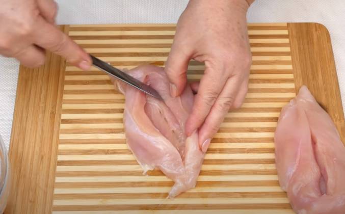 2. Маринад хорошо перемешиваем и пока отставляем в сторону. Сейчас займемся куриным филе - у меня 6 штук, общим весом 800 г, с которых я уже срезала малое филе. С внешней стороны каждого филе острым ножом делаем неглубокий надрез и с двух сторон подрезаем вот такие кармашки для будущей начинки, чтобы в результате получилась лодочка. Еще раз - сильно не разрезаем, чтобы не повредить филе, надрезаем с одной стороны, и с другой, делаем вот такие заготовки. Погружаем подготовленное таким образом филе в маринад и складываем один на один, пусть маринуется. Тем временем подготовим начинку - сегодня у меня сырно-овощная.