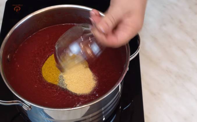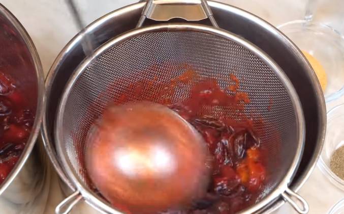 3. Выключаем плиту, снимаем кастрюлю и протираем сливы через сито или дуршлаг. В результате у нас получается вот такое однородное пюре без косточек и хвостиков. Жмых я не выбрасываю, а добавляю яблоки и варю из него компот. Снова устанавливаем кастрюлю на плиту и всыпаем на это количество пюре 400 г сахара, 25 г соли - это две чайные ложки, 4 чайные ложки с горкой приправы Карри - по весу это 40 г, 1 чайную ложку без верха красного острого перца - это 3 г, 1 чайную ложку черного молотого перца - это тоже 3 г и всыпаем 1 чайную ложку сухого чеснока - по весу это 6 г, если такого нет, то измельчите 4-5 зубчиков свежего.