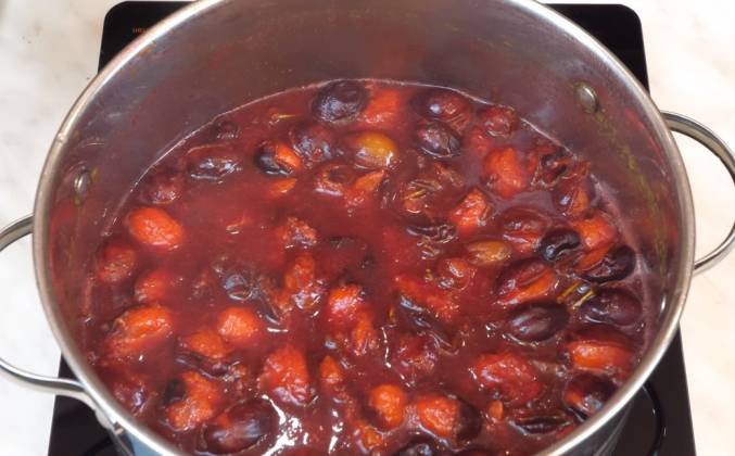 4. Массу хорошо перемешиваем до полного растворения соли и сахара, доводим соус до кипения, убавляем нагрев ниже среднего и кипятим ровно 10 минут. Старайтесь от кастрюли далеко не отходить, мешайте постоянно, иначе может пригореть! Соус получается очень ароматный, пряный, вкусный и если вы никогда ничего подобного не готовили и не пробовали, рекомендую всем! Тем более, многие пишут, что у них очень большой урожай слив и если есть такая возможность, обязательно приготовьте и не одну порцию, чтобы зимой не жалеть, что сделали мало! Спустя 10 минут разливаем соус в заранее стерилизованные баночки и герметично закрываем прокипяченными крышками.