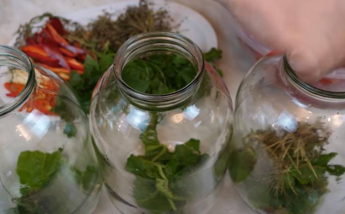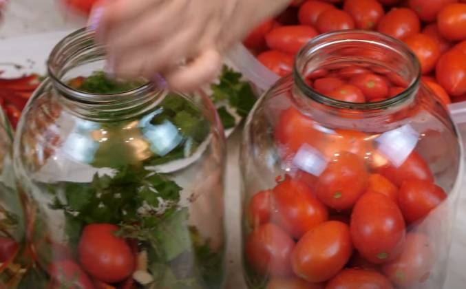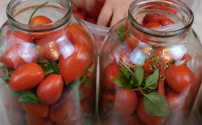 3. Количество трав и пряностей берите на ваше усмотрение, я делаю так, как любят в моей семье, точные пропорции укажу в конце видео и в описании. Помимо этого, в каждую трехлитровую банку добавляем по одному крупному или по два маленьких лавровых листа, по 5-6 горошин душистого перца, по 10-15 горошин черного перца, по 3 бутона гвоздики, по пол чайной ложке семян кориандра и до самого верха докладываем помидорами. Не набивайте банки очень плотно, иначе помидоры лопнут, лишь слегка потрясите для более равномерного распределения.
