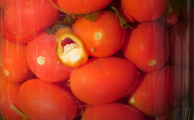 2. На дно каждой из них раскладываем понемногу листьев хрена, зонтики укропа, по несколько веточек петрушки, базилик, свежий сельдерей, по одной веточке свежего или сушеного эстрагона - он же тархун, по несколько кусочков острого перца, можете положить по целой перчине, чеснок, разрезанный пополам и болгарский перец - красный или зеленый. Следом закладываем помидоры. Я их хорошо мою, но не накалываю, обсушивать их не надо. Помидоры, приготовленные по этому рецепту настолько вкусные, что даже маринад весь выпивается - еще не было ни одного человека, кому они не понравились! Закладываем томаты примерно на две трети банки, добавляем еще по веточке базилика, петрушки, остатки острого перца, чеснока и болгарского перца.
