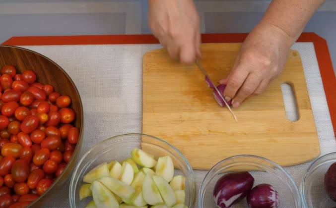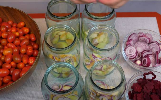 3. Это как говорится "кому делать нечего", есть время - играйтесь, нет - просто произвольно нарежьте свеклу! Обрезки тоже можно запустить в баночки или приготовить свекольную икру, пассеровку для борща, сварить и сделать салат или просто заморозить - у нас ничего не должно пропасть! Я лишь хочу подать вам идею, как можно красиво украсить банки с соленьями, а выбор за вами! Кроме этого нужно подготовить банки, хорошо их помойте, стерилизовать не надо. Берите стеклянную тару любого объема, т.к. маринад будем готовить из расчета на 1 литр воды - у меня 6 литровых банок. На дно каждой литровой банки раскладываем по одному яблоку, порезанному на дольки, колечки репчатого лука - хотите разделяйте его как я или оставьте как есть!