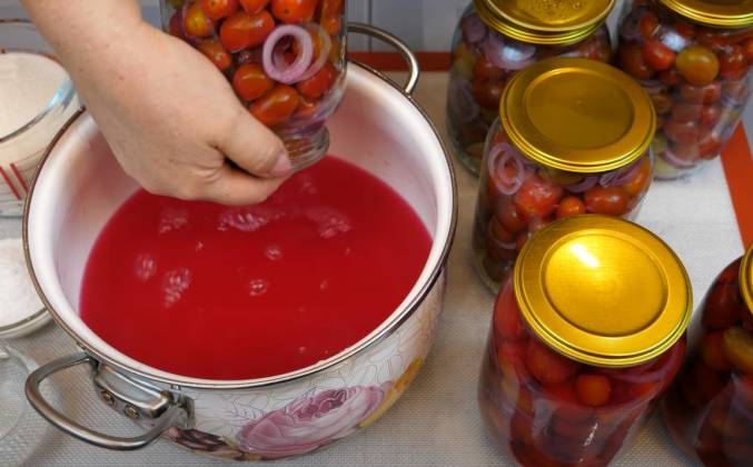 5. Накрываем их крышками и оставляем на столе практически до полного остывания, но не меньше, чем на 1 час. Спустя час, сливаем с чуть теплых банок красивую розовую водичку в кастрюлю, и на ее основе будем варить маринад. Обратите внимание, что маринад готовится из расчета на 1 литр воды, поэтому обязательно взвесьте или отмерьте мерной посудой количество жидкости. У меня получилось два с половиной литра розовой водички, за кадром я долила ее до трех литров и теперь всыпаем в кастрюлю 450 гр сахара, 75 гр соли и вливаем 150 мл 9% столового уксуса. Маринад хорошо перемешиваем, отправляем на плиту и доводим его до кипения, а как только он закипит, заливаем банки кипящим маринадом, закатываем или закрываем винтовыми крышками.
