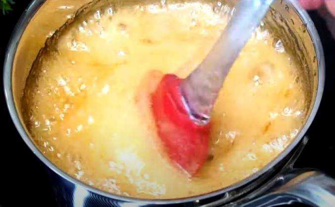 3. Теперь берём кастрюлю, я беру ковш, наливаем 300 грамм меда в ковш и ставим на огонь, доводим до кипения, как только мед закипит, добавляем постепенно сахар, 5 столовых ложек и продолжаем варить, проверить готовность можно так, берём каплю сиропа, опускаем в холодную воду, должна получиться тянущая карамель, снимаем с огня, по времени занимает примерно 2 минуты. Заготовки кладем в большую кастрюлю, поливаем сиропом и перемешиваем, кладём на тарелку и влажными руками формируем горку, по желанию можно посыпать орешками.Видео рецепт ютуб ниже 👇