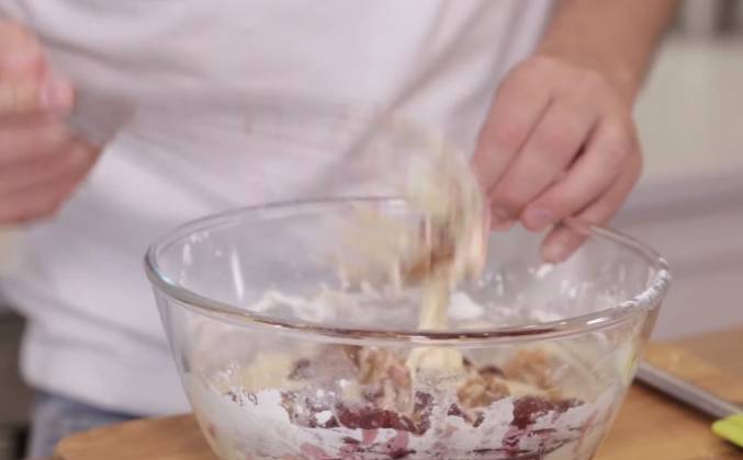 3. Далее беру орехи, зачем орехи? Для того чтобы была хрустящая, отличная структура. И теперь с помощью силиконовой лопатки все хорошенько объединим. Добавили все вишни, а теперь возьмем орехи и чуточку их измельчим. Есть, и также добавляем сюда. И теперь всё вот так вот, очень тщательно, но очень нежно, вымешиваем, посмотрите, это уже очень вкусно. Берем форму, выкладываем в нее пергамент и сверху заливаем тесто для вишневого пирога, который отправим запекаться Это так красиво... Честно говоря, это все, что нужно сделать. Я уверен что вы даже сможете это сделать с ребенком с вашим или ребенок сам сможет приготовить этот рецепт. Ну что, теперь отправляем духовочку , температура 180 градусов на 30 минут.