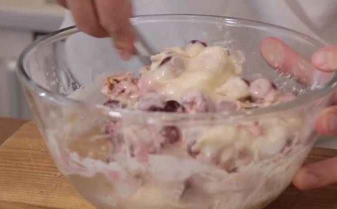 2. Далее берем муку, и вот так засыпаем и щепотку соли есть И теперь так же венчиком вымешиваем, если есть желание, можете это делать руками ложкой, а на самом деле мне нравится больше всего это делать венчиком, почему? Потому что, я чувствую как тесто живет. Вот оно было такое нежное, теперь стало чуточку плотнее. Хорошо все вымешиваем и тесто для нашего вишневого пирога - готово. Далее добавим самое вкусное - это вишня. Можно добавлять их сюда, одну сюда, одну сюда, одну сюда, одну сюда. Я так делал с самого детства.