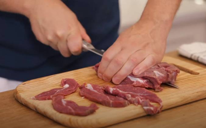 2. Теперь грибы перекладываем в емкость, вот сюда, мясо можно нарезать и нужно нарезать такими тонкими тонкими слайсами или тонкими кусочками, примерно вот. Если у вас есть в мясе вот такая прожилка,ее можно, вдоль неё разрезать это мясо, для того чтобы легче нарезалось, и нарезать его дальше. Теперь чуточку соли, перца и займемся моим любимым делом - будем отбивать мясо. Перец, пищевая пленка, для того чтобы после отбивания не мыть молоток. И теперь будем все обжаривать на подсолнечном масле на большой температуре, как всегда.