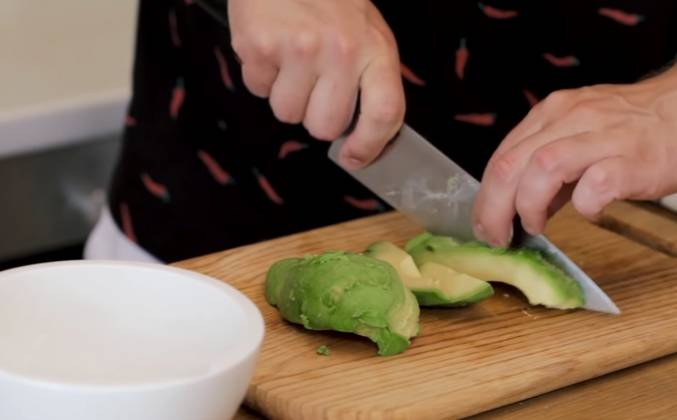 2. Очищаем авокадо, нарезаем его довольно крупным кубиком.Смотри, какой он жирный. Обозначает, что соус будет крутой. Вообще, гуакамоле - это традиционный мексиканский соус, и я буквально лет 5 назад работал, точнее был бренд шефом одного мексиканского ресторана, и именно там я научился делать такой тру-тру правильный гуакамоле. Берем авокадо и нарезаем довольно, довольно большими, вот такими кубиками. Нарезка не имеет значения потому, что мы все будем измельчать. То же самое делаем и с вот этим. Перекладываем все в ступку. И думаю,мне этого хватит. После акадо нам нужно нарезать красный лук. Его нужно нарезать очень-очень-очень мелко, потому, что я не хочу чтобы в гуакамоле чувствовался сильно вкус лука.