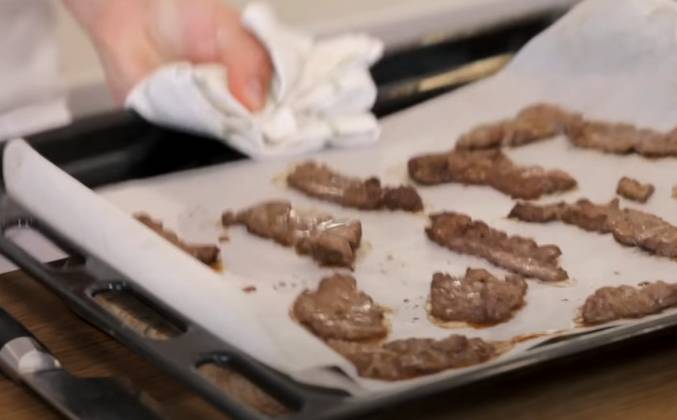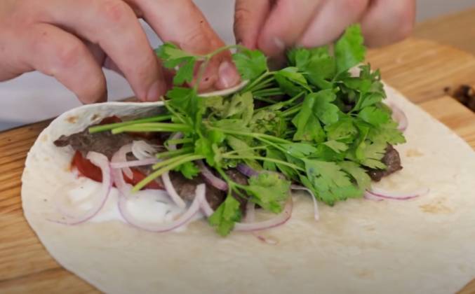 3. Ждем пока мясо приготовится и будем формировать дёнер. А тем временем вы можете перейти по ссылочке которая есть под этим видео. Там вы сможете зайти на мой сайт и увидеть этот же рецепт. 10 минут прошло. Мясо готово! Достаем. Посмотрите - оно приготовилась, но осталось сочным. Это очень важно для меня. И теперь дело за малым - поперчим, добавим чуточку соли и можем формировать дёнер. И так вот Здесь сначала намазываем кетчупом, чуточку белого соуса, томаты, мясо, лук. Небольшой секретик: я беру вот так вот со стеблями, я беру петрушку и вот так вот, сверху выкладываю. Она даст такого необычного хруста и очень хорошего вкуса и теперь просто делаем ролл. Первый дёнер сформировали, делаем второй.