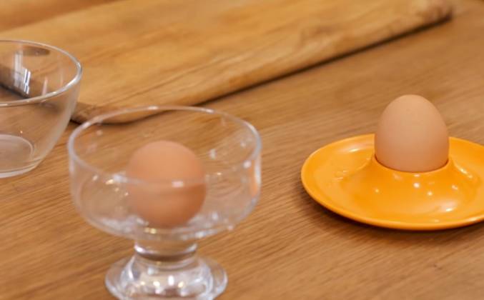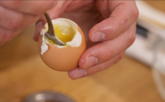 3. Второй способ - это уже более современный. Для меня он был новый когда я им научился. Смысл этого способа состоит в чем, что мы в холодную воду бросаем яйцо, потом оно закипает и мы снимаем с огня. И таким образом оно стоит около 10 минут. 10 минут пока вода еще горячее желток яйца в целом готовится, и должна быть очень нежная структура по итогу. Перекладываем сюда. Ну что а теперь настало время проверить, что у нас получилось с яйцами внутри. Итак 1 яйцо мы варили три минуты. У меня есть специальный такой девайс. Три минуты и желток очень нежный, и это получилось - всмятку. Теперь проверяем яйцо которое готовилось 6 минут. Для того чтобы яйца были приготовленными, после того как запищал таймер нужно срочно их под холодную воду.