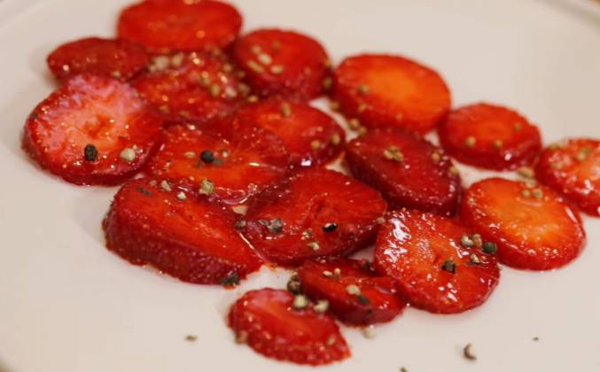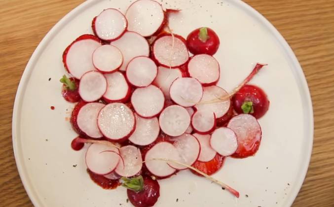 Салат с клубникой и редиской по рецепту Евгения Клопотенко. С этой клубникой мы сделаем что-то очень божественное. Это будет похоже на салат, но на самом деле это будет карпаччо с редиской и клубникой. Для приготовления этого блюда нам нужно: редиска, клубника, микс перцев, кориандр, лимон, соль и оливковое масло. Это очень вкусно, очень по-новому и очень свежо.