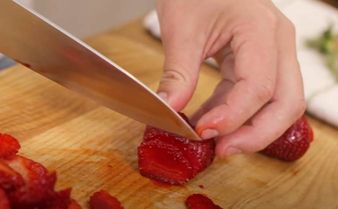 Вот такими вот довольно тонкими кольцами нарезаем клубнику. Эта нарезка называется или кольцами или, если мы это все выложим на тарелку, получится у нас карпаччо. На самом деле, время для нарезки этого салата, точнее, время для нарезки этого карпаччо, уйдет столько же, сколько для приготовления винегрета - не очень много.
