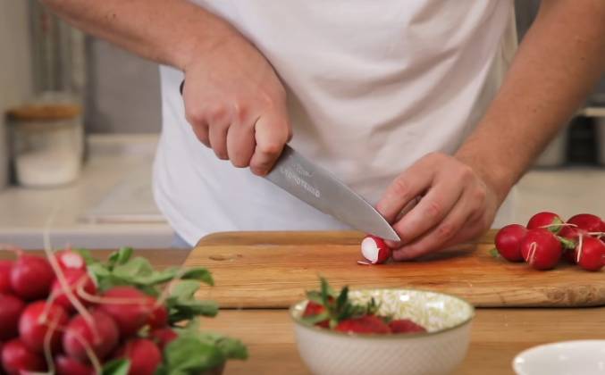 2. Если вы готовите винегрет часто, то нарезка, на нарезку вас уйдет очень мало времени. я нарезал клубнику, теперь добавляем соль. Да, мы добавляем соль в клубнику, да, это странненько, но это очень хорошо. Потом - лимонный сок. Небольшие укольчики Есть. Грубо говоря, мы сейчас маринуем клубнику. То, что она начала иметь более яркий вкус - я добавляю обычное масло, оливковое, но советую добавлять вам extra virgin зеленый. Она будет давать еще одну такую горчинку. Это будет очень круто. Хорошо, хорошо вымешиваем и пробуем должен быть такой лимонно солененький вкус если вкус такой есть - это отлично. Отставляем на 10 минут, пускай клубника маринуется А тем временем нарежем такими же кусочками редис. Чем тоньше вы нарежете - тем лучше но на самом деле можно сильно не заморачиваться. Эти хвостик я не выбрасываю, потому что их там же можно есть.