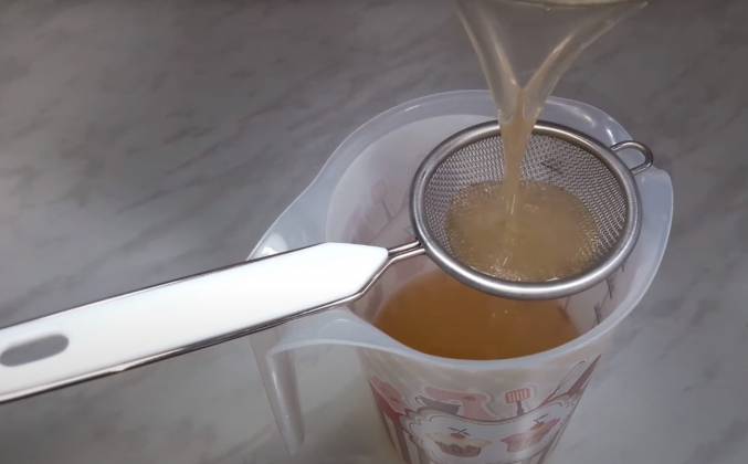 3.  Как только смесь начала закипать – убавляем огонь, чтобы избежать сильного увеличения объёма кипящей жидкости, и дальше, при периодическом помешивании, кипятим глазурь, приблизительно 3-5 минут. При этом нужно подобрать у себя подходящую температуру, чтобы обеспечить правильное кипение. Обычно, это средне-низкая мощность. 4.  Затем снимаем глазурь с плиты, сразу же добавляем лимонную кислоту (для активации пектина) и очень хорошо перемешиваем. И когда основные пузыри сошли, переливаем нейтральную глазурь через ситечко в стакан или другую ёмкость, в которой дальше будем хранить глазурь. Процесс приготовления глазури практически завершён. Теперь её нужно накрыть плёнкой в контакт и отправить в холод для стабилизации.