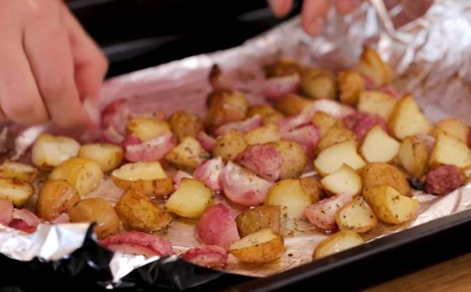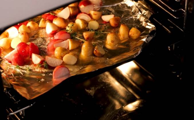 2. Теперь берем противень, застилаем его фольгой Соль, оливковое масло вот так чуточку тимьяна и отправляем в духовку температура 180 градусов как ни странно правда всегда все что запекаю это моя базовая и любимая температура 180 градусов на 25 минут. Тем временем пока запекается редиска с картошкой нам нужно взять томаты черри и разрезать на две части сегодня у нас такая тренировка разрезания круглых предметов на 2 или 4 части.