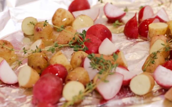 Салат из запеченной молодой картошки и запеченного редиса по рецепту Евгения Клопотенко заинтригованы? Тогда продолжаем смотреть. Для приготовления этого блюда нам надо: редис, молодой картофель томаты черри, соль, тимьян, оливковое масло. Я уверен что если вы смотрите это видео то вы точно знаете, что все мои рецепты максимально простые и максимально вкусные и самое главное что они у большинства людей я уверен получаются, если вдруг у вас что то не получилось пишите в комментариях что у вас не получается для того чтобы я был в курсе.