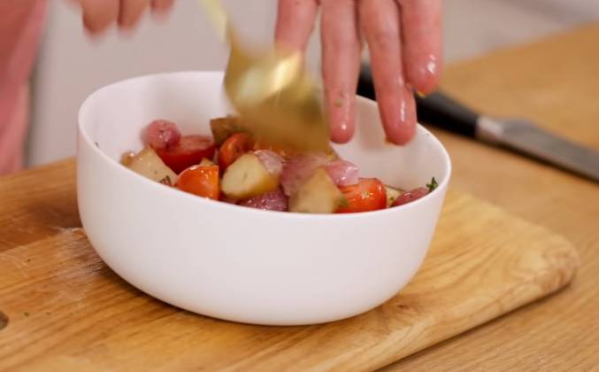 3. Вот таким образом нарезаем томаты и в целом все ждем пока приготовятся овощи и будем их смешивать. Посмотрите редиска имеет очень необычный вкус но этот вкус очень вкусный Пуская это тавтология но это правда просто попробуйте сделайте это и вы будете удивлены 100%. Томаты, картошка с редисом запеченным в целом тут уже есть все есть основа есть кислинка которая получится у нас от томатов и нету еще одного аромата поэтому я беру тимьян и вот так его посыпаю этим тимьяном салат он сразу приобретает такую Итальянскую нотку правда в Италии Я уверен тоже не запекают редис, но тем не менее чуточку оливкового масла, немного! Какой крутой цвет, посмотрите что получается просто красота, свежий молотый перец, красивая тарелка.