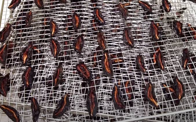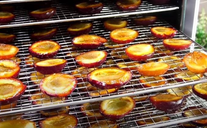 2. Во время сушки теперь сливы разрезаем на две части, и убираем косточку, укладываем сливу шкуркой вниз на решетку, устанавливаем решетки в дегидратор. При какой температуре сушить сливу? устанавливаем температуру 40 градусов, сушим 4 часа, теперь отключаем и делаем перерыв на 45 часов, это необходимо для того чтобы избежать выделение сока, если вы затем возобновляем процесс сушки.