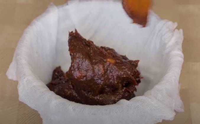 2. Когда масса стала густой, нужно активно мешать и не оставлять без присмотра. Когда масса стала совсем густой и тянучей, добавить пряности на свой вкус. Можно добавить орехи, корианд, корицу, сухофрукты. Поварить ещё 15-20 минут при постоянном помешивании. Чтобы проверить готовность сыра, закатайте небольшой шарик на влажную марлю. Сыр должен хорошо сниматься с марли. Дать пюре остыть до тёплого состояния. Подготовить посуду. Положить в неё хорошо выжатую влажную марлю. Поместить туда пюре и сформировать головку с помощью марли. Чем больше пюре, тем дольше сыр будет сохнуть. Выложить сыр на доску и прижать второй доской.