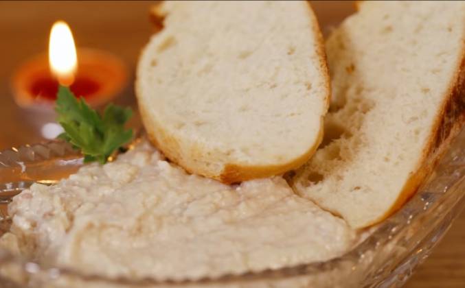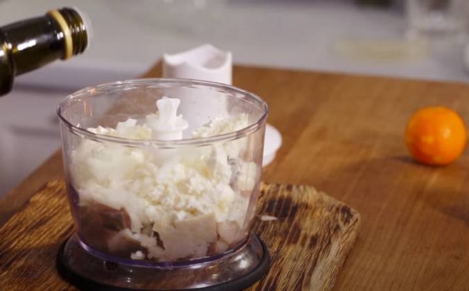 2. Творога примерно нужно половину веса, если у вас 200 граммов сельди то уже где-то 100 граммов творога. Ну и конечно же лук,лук нужен нам для сладости. Собственно говоря вот и все,чуточку оливкового масла и можно взбивать пока не получим однородную и пышную структур. Получилась очень нежная структура благодаря творогу смотрите. То что нужно. Очень хорошо,теперь перекладываем все в красивую емкость. Обычно форшмак едят с чёрным хлебом или с бородинским,но я советую мой вариант,есть с белым хлебом. Форшмак готов. Теперь можно попробовать.