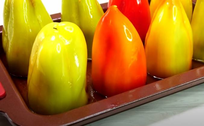 4. Теперь перец смазываем растительным маслом вливаем немного воды ставим в духовку и запекаем до готовности при температуре 180 градусов по времени примерно 50 минут или ориентируйтесь в своей духовке как перец начнет сверху румянится смазываем его получившимся соусом и прикрываем фольгой.