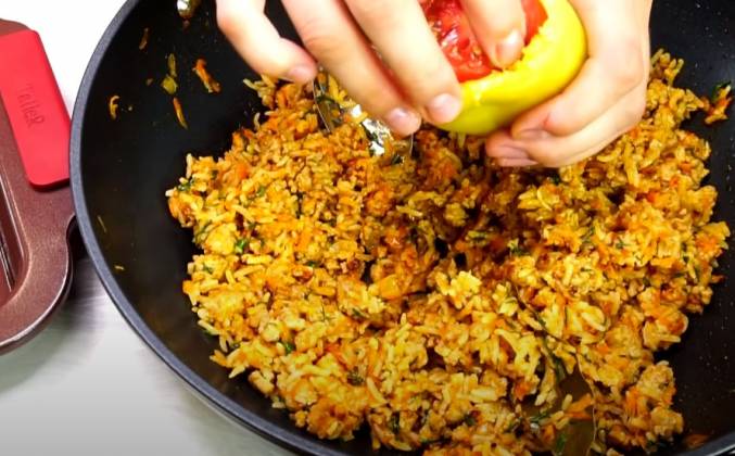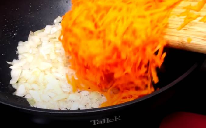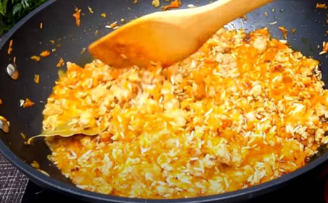 2. Добавляем морковь жарим все вместе минута две и добавляем 400 грамм фарша жаримся вместе еще минуты 2 3 добавляем промытый рис 100 грамм перемешиваем добавляем половину чайной ложки соли черный перец лавровый лист сладкую паприку выливаем воду примерно 150 миллилитров закрываем крышкой и тушим до готовности риса минут 10 15 когда рис будет готов перемешиваем порежем зелень и добавим начинку.