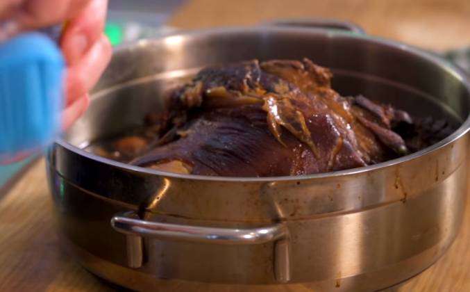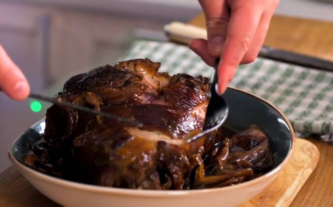 4. Ну что, новогодняя рулька готова. Я очень боюсь пробовать рульку потому что мне кажется что я могу ее съесть полностью, а это потом будет тяжело дышать, ну ничего. Она очень аппетитная, очень нежная посмотри какое мясо она просто отпадает от кости. Такой сладковатый вкус это тот вкус который я хотел добиться благодаря добавлению пиво и медовой горчицы. Это очень вкусно и я просто вам советую приготовьте это для своих родных и близких и они будут очень благодарны, потому что этот рецепт максимально простой все оставшееся время пока только запекается вы можете заниматься собой или например приготовить что-то еще.Видео рецепт ютуб ниже 👇