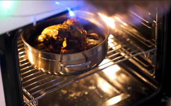 3. Если вас духовке есть режим гриль то поставьте на него это будет еще эффективней. 15 минут прошло, проверим как там наша рулька. Это очень ароматно благодаря горчицы корочка получилась такая хрустящая темная ,ароматная,раньше это было пиво, теперь это стало соусом и собственно говоря все готово итак по-новогоднему не хватает лишь такой елки дед мороза и бокала шампанского ну ладно, не будем мечтать сделаем презентацию. Конечно если у вас в семье много людей, то одной рульки вам будет мало,но всегда можно приготовить больше. Овощи будут нам прекрасным гарниром они два часа томились стали очень нежными и очень вкусными, и теперь чуточку соуса наливаем сверху вот так.