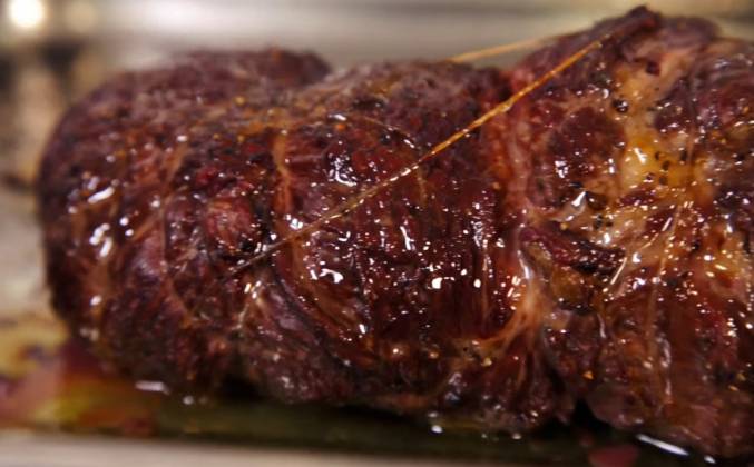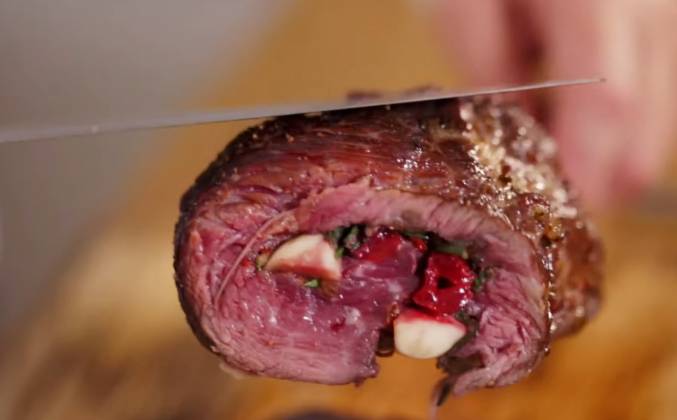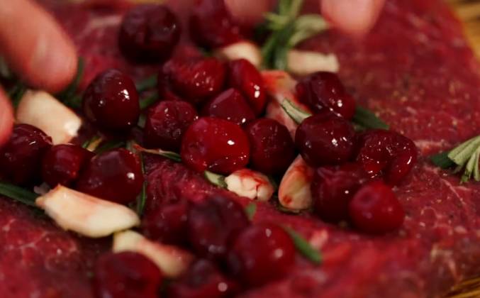 Мясной рулет с ягодами в духовке по рецепту Евгения Клопотенко. Для приготовления этого рулета вам нужно, говяжий ошеек, вишни,чеснок,и розмарин,также вам понадобится кулинарная нить,ну конечно же самого начала вам нужно выбрать правильное мясо.