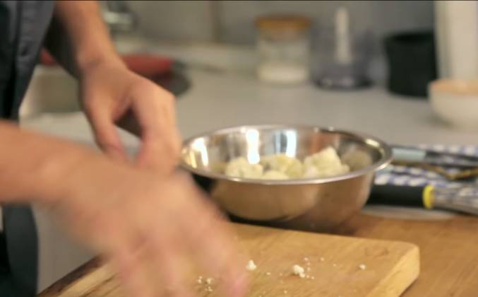 4. Пока цветная капуста запекается,мы сделаем соус. Если у вас есть сливки, то лучше использовать сливки,но я знаю что часто не каждого дома есть сливки 33 процентов,поэтому мы сделаем такую жирное молоко сделаем, возьмем молоко,добавим в него около 40 граммов сливочного масла. И сделаем так чтобы от сливочное масло растопилось в молоке. После этого эту массу будем вводить в сыр фета и таким образом вас получится очень простой и очень вкусный соус. Буквально чуточку и все,теперь у нас получилось такое жирное молоко,будем вливать его в сыр. Теперь нам нужно смешать фета, фету я взял такую максимально мягкую. И по чуть-чуть добавляемые в нее,нашего жирное молоко. И хорошенько вымешиваем ложной до однородности.