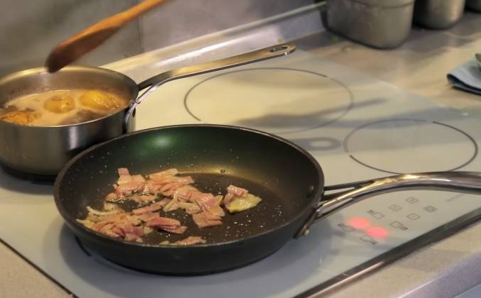 3. Далее я беру чеснок один зубчик чеснока отправляю в картофелю добавляю, добавляю соль,и буду варить,буду варить как этом мы делаем всегда,примерно 20 минут на среднем огне после чего я достану картофель и буду есть,и вы просто поверьте мне я буду очень сильно удивлен,а точнее вы наверное будете сильно удивлены когда попробуйте этот вкус.Потому что как всегда все вроде бы просто вроде бы ничего сложного но в то же время это будет нереально,это картошка будет очень сильно отличаться от той которую вы ели ранее, просто поверьте мне и сделайте это. Ставим на средний огонь. Варим примерно 20 минут,теперь бекон,и лук полукольцами. Обжариваем буквально полторы минутки, можно это делать без подсолнечного масла что б было более полезно. Картофель уже почти готов,его я проверяю обычной ложкой,если ложка проходит.