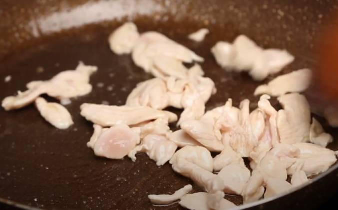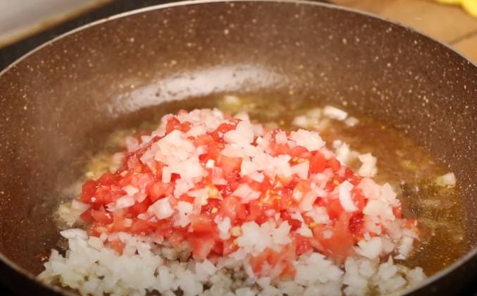 2. Сначала обжарим куриную грудку со всех сторон. Насыпим щепотку черного и красного молотого перца. Обжарим 2-3 минуты и можно убирать. Затем сразу растопим 20 г. сливочного масла и опустим мелконарезанный лук с помидорами. Обжариваем 3-4 минуты до сгущения массы. Наш соус готов. На противень с бумагой для запекания выльем половину от общего количества жидкого теста и уберем в разогретую духовку на 10-15 минут. Выпекаем при температуре 180 градусов по Цельсию. Далее нанесем тонким слоем наш соус. Посыпим мелко тёртым сыром Моцарелло.