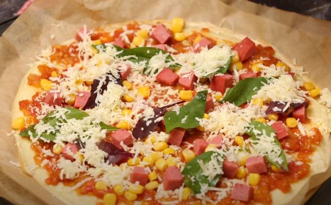 3. Добавим по вкусу колбасу, консервированную кукурузу. И базилик со шпинатом по вкусу. Сверху еще раз посыпим тертым сыром. Также стоит учесть, если колбаса не соленая, то можно добавить щепотку соли. Выпекаем при температуре 180 градусов по Цельсию около 10 минут на нижнем уровне в духовке. Конвекция воздуха снизу. Пицца готова. Получается мягкой, сочной и очень вкусной. Далее аналогично нальем вторую половину жидкого теста на противень с бумагой и выпекаем около 10 минут при температуре 180 градусов.