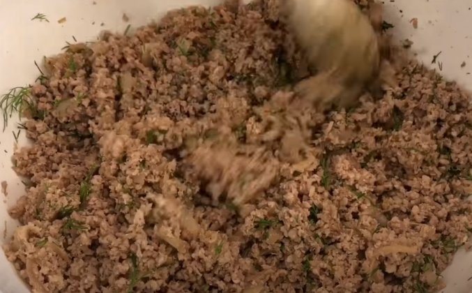 2. Отваренное мясо пропускаем через мясорубку вместе с чесноком. Отвариваем яйца. На сковороде разогреваем растительное и сливовое масло и обжариваем лук до мягкости, предварительно нарезанный полукольцами. Приправляем специями, солим и перекладываем в большую мыску. Добавляем перекрученное мясо. Солим по вкусу. Мелко рубим укроп, отправляем к мясу. Яйца нарезаем мелкими кубиками и соединяем с фаршем. Все тщательно перемешиваем. Если фарш суховат, добавляем несколько ложек бульона.