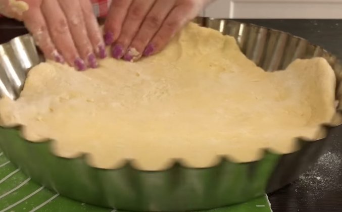 3. Форму диаметром 26-27 см смазываем растительным маслом. Охлажденное тесто выкладываем на стол, присыпанный мукой. Вымешиваем до тех пор, пока тесто не будет липнуть к рукам. Затем делим тесто на 1/3 и 2/3 части. Большую часть теста раскатываем в пласт диаметром чуть больше формы. Аккуратно переносим его в форму и распределим, формируя бортики.
