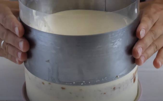 4. Сборка торта. Бисквит разрезать на 3 коржа. На подложку положить первый корж, пропитать курдом, обернуть корж плотной ацетатной лентой, сверху надеть кольцо. Продолжать сборку торта в кольце. Мусс поделить на 3 части. Вылить 1/3 мусса на корж. Следующий корж пропитать курдом, выложить его поверх мусса в кольцо. Сверху вылить еще 1/3 мусса. Последний корж пропитать, выложить в кольцо на мусс и вылить последнюю часть мусса. Убрать торт в холодильник на стабилизацию примерно на 5 часов, лучше на ночь. После стабилизации снять кольцо и ацетатную ленту.