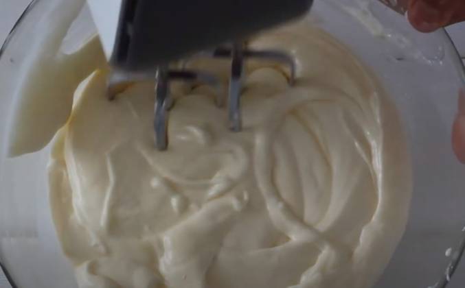 3. Лимонный мусс. Отложить 3 ст.л. курда для пропитки бисквитов. Желатин залить холодной водой для набухания. Холодные сливки взбить до устойчивых пиков. Добавить к сливкам курд, сахарную пудру, перемешать лопаткой, потом миксером на низких оборотах несколько секунд лишь до объединения (при необходимости) Набухший желатин нагреть в микроволновке 5 секунд до жидкого состояния. Влить желатин в лимонную массу, перемешать лопаткой, затем на низкой скорости миксера в течение нескольких секунд объединить массу.