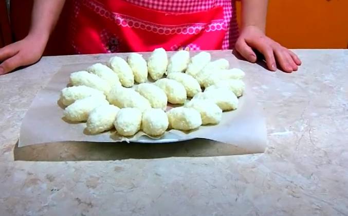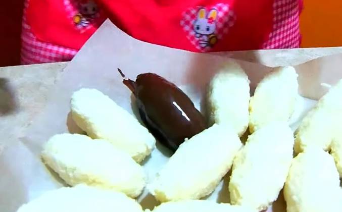 2. Теперь я из нашей начинки, буду лепить небольшие колбаски. Вот так примерно будем делать, и формируйте что вы хотите. Если хотите, можете кружочки, можете колбаски, я буду вот такие не большие делать колбаски. И я вот приготовила рядышком тарелочку, постелила пергаментную бумагу и буду на нее выкладывать. Наши батончики готовы. Теперь мы должны отправить их на пол часа в морозилку. За 5 минут до того как вы их будете доставать, растопите шоколад либо на паровой бане, либо в микроволновке. Наши батончики застыли, Как видите они вот легки снимаются и стали такие тверденькие и будет легко обмакивать.